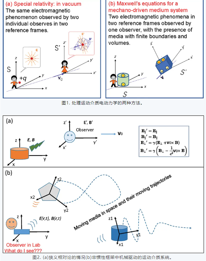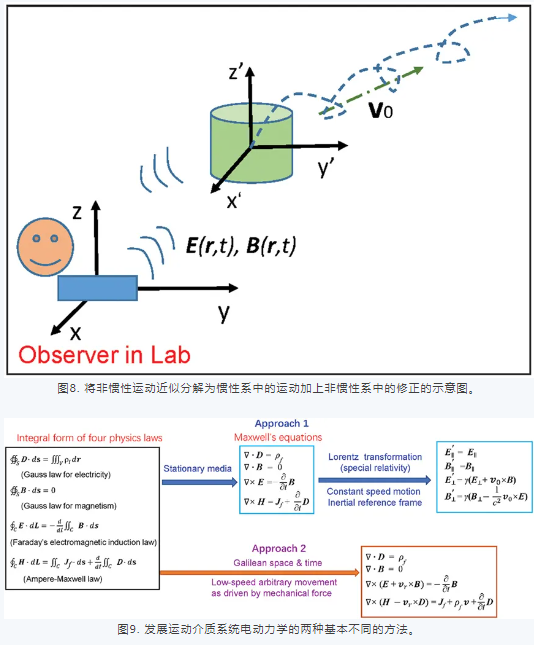 - 为了计算运动介质的电磁场,材料的本构关系是必须的。这些本构关系可以作为求解麦克斯韦方程组的补充条件。闵可夫斯基的观点是建立在一个假设的基础上的,即介质的性质和在其他惯性系中相应的本构方程保持不变。这有两个要求:沿直线匀速运动或在惯性参照系中运动,并预先确定相应的本构方程。然而,如果介质以加速度沿着复杂的轨迹运动(图1b),并且对于形状可变形的材料或液体,速度可能是时间和位置的函数,那么在这种情况下,从数学上不可能描述运动介质的电磁场。更重要的是,实际介质/材料可能是各向异性的,其介电常数强烈依赖于频率甚至晶体取向,因此,应考虑介质色散关系。而这种情况在实际材料的工程应用中经常发生。