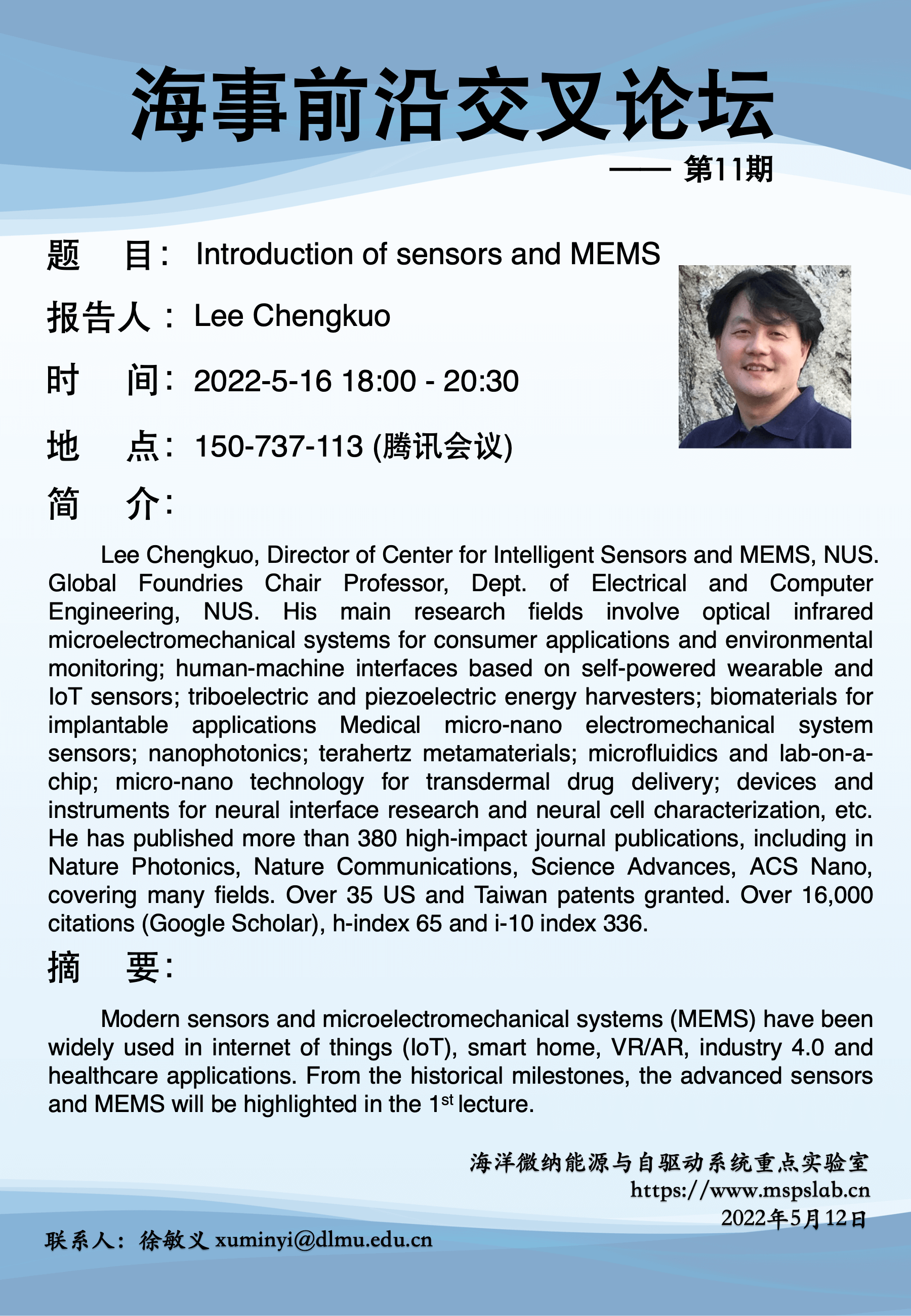 海事前沿交叉论坛第11期,由来自新加坡国立大学的Lee Chengkuo教授主讲,介绍现代传感器和微机电系统 (MEMS),及其在物联网 (IoT)、智能家居、VR/AR、工业 4.0 和医疗保健中的应用。