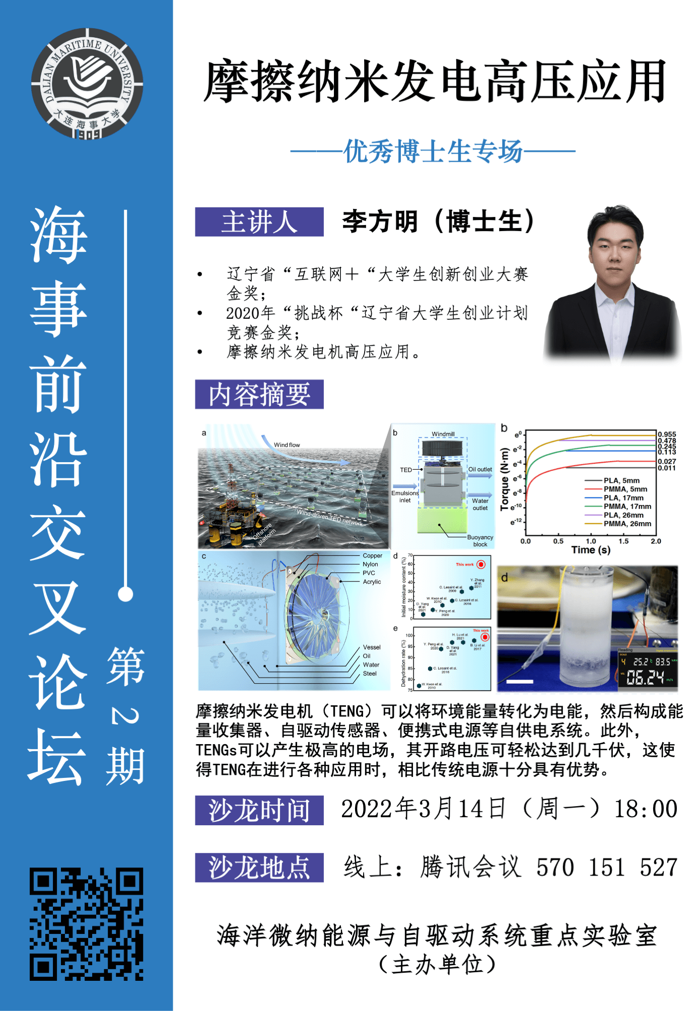 海事前沿交叉论坛第2期--优秀博士生专场,由李方明博士生主讲,内容主要包括对研究生科研的经验分享。从如何快速学会科研和如何加快成果产出速度两方面分享科研经验。