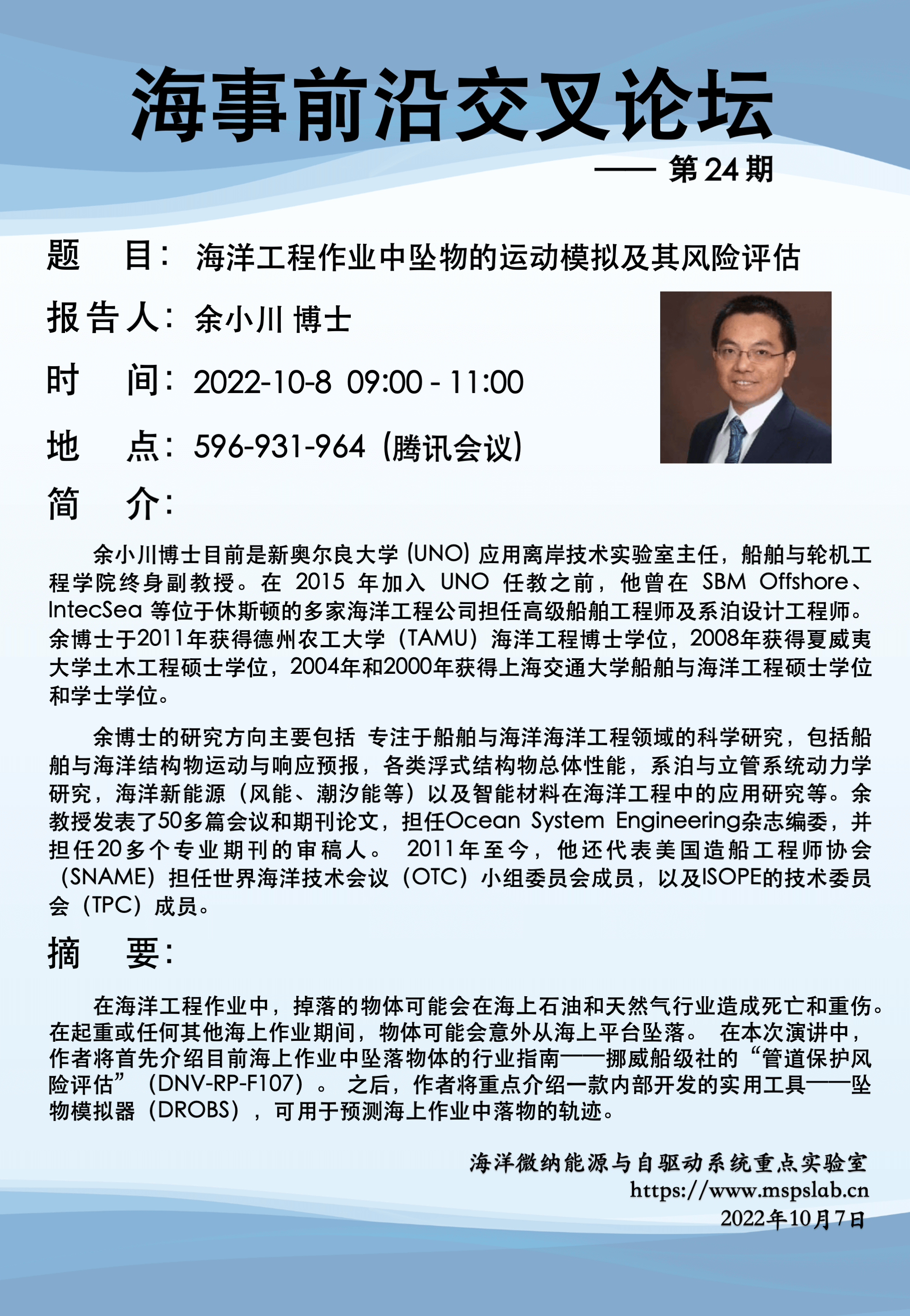 余小川博士目前是新奥尔良大学 (UNO) 应用离岸技术实验室主任,船舶与轮机工程学院终身副教授。在 2015 年加入 UNO 任教之前,他曾在 SBM Offshore、IntecSea 等位于休斯顿的多家海洋工程公司担任高级船舶工程师及系泊设计工程师。余博士于2011年获得德州农工大学(TAMU)海洋工程博士学位,2008年获得夏威夷大学土木工程硕士学位,2004年和2000年获得上海交通大学船舶与海洋工程硕士学位和学士学位。余博士的研究方向主要包括 专注于船舶与海洋海洋工程领域的科学研究,包括船舶与海洋结构物运动与响应预报,各类浮式结构物总体性能,系泊与立管系统动力学研究,海洋新能源(风能、潮汐能等)以及智能材料在海洋工程中的应用研究等。余教授发表了50多篇会议和期刊论文,担任Ocean System Engineering杂志编委,并担任20多个专业期刊的审稿人。 2011年至今,他还代表美国造船工程师协会(SNAME)担任世界海洋技术会议(OTC)小组委员会成员,以及ISOPE的技术委员会(TPC)成员。