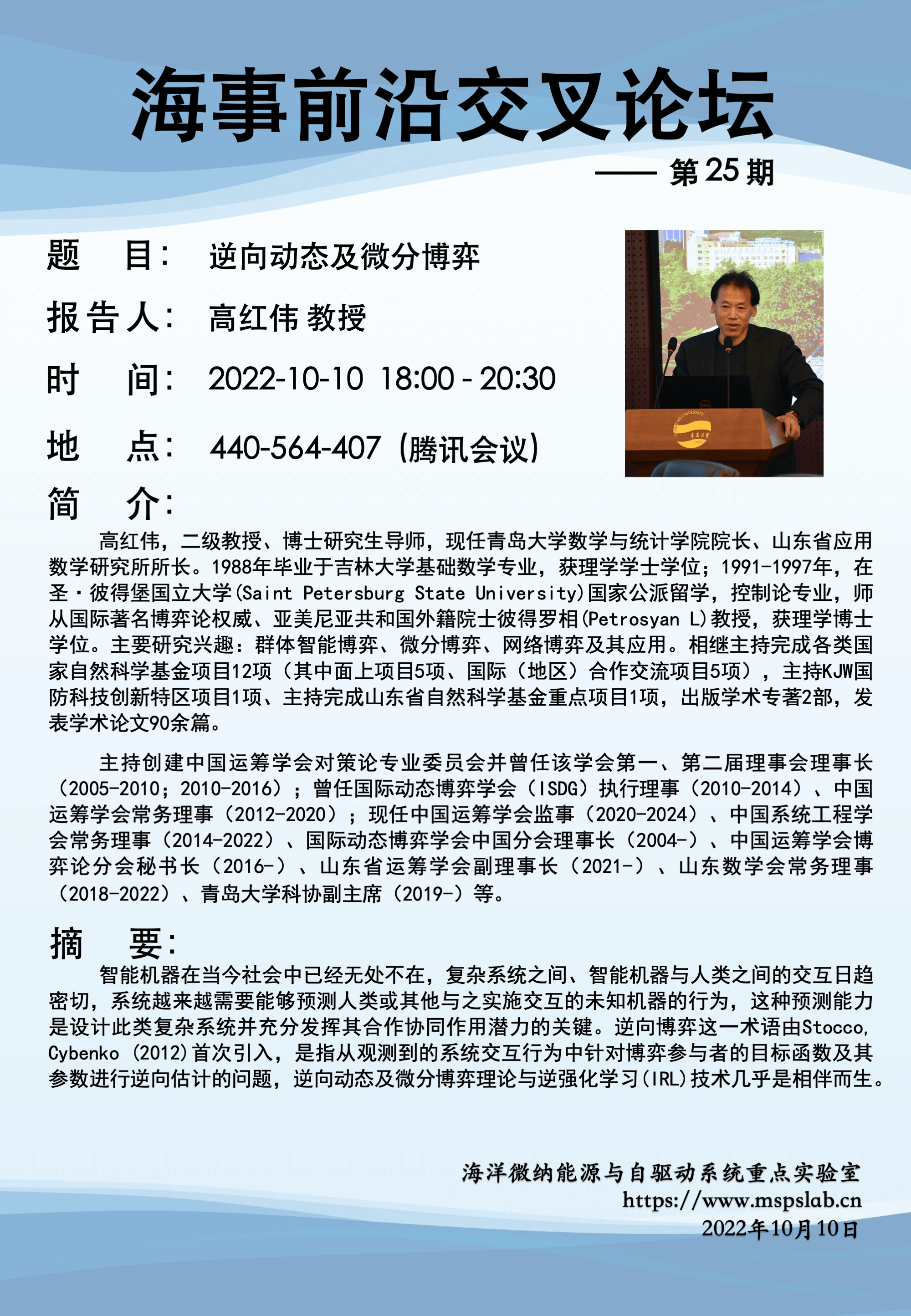 高红伟,二级教授、博士研究生导师,现任青岛大学数学与统计学院院长、山东省应用数学研究所所长。1988年毕业于吉林大学基础数学专业,获理学学士学位;1991-1997年,在圣·彼得堡国立大学(Saint Petersburg State University)国家公派留学,控制论专业,师从国际著名博弈论权威、亚美尼亚共和国外籍院士彼得罗相(Petrosyan L)教授,获理学博士学位。主要研究兴趣:群体智能博弈、微分博弈、网络博弈及其应用。相继主持完成各类国家自然科学基金项目12项(其中面上项目5项、国际(地区)合作交流项目5项),主持KJW国防科技创新特区项目1项、主持完成山东省自然科学基金重点项目1项,出版学术专著2部,发表学术论文90余篇。主持创建中国运筹学会对策论专业委员会并曾任该学会第一、第二届理事会理事长(2005-2010;2010-2016);曾任国际动态博弈学会(ISDG)执行理事(2010-2014)、中国运筹学会常务理事(2012-2020);现任中国运筹学会监事(2020-2024)、中国系统工程学会常务理事(2014-2022)、国际动态博弈学会中国分会理事长(2004-)、中国运筹学会博弈论分会秘书长(2016-)、山东省运筹学会副理事长(2021-)、山东数学会常务理事(2018-2022)、青岛大学科协副主席(2019-)等。