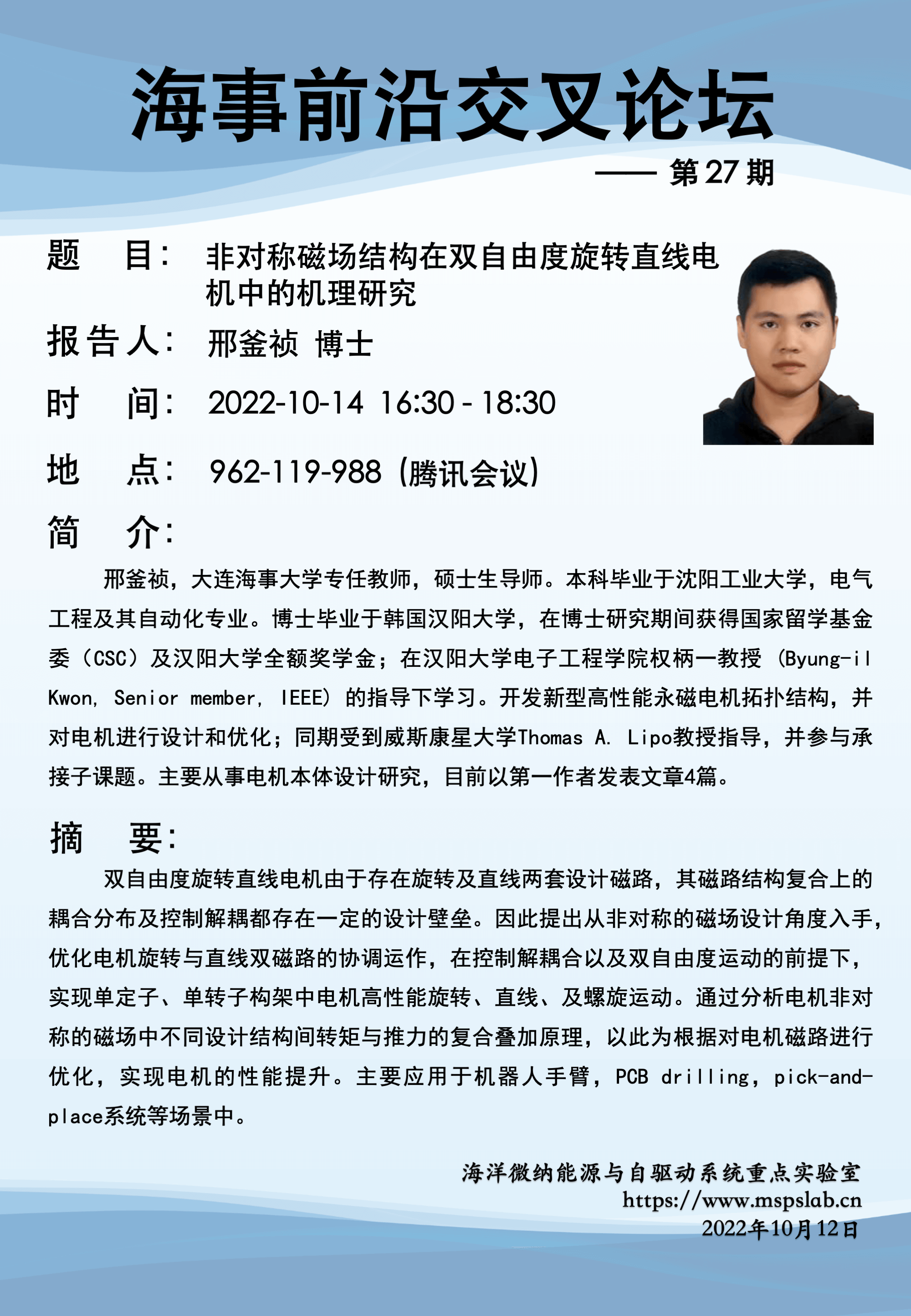 邢釜祯,大连海事大学专任教师,硕士生导师。本科毕业于沈阳工业大学,电气工程及其自动化专业。博士毕业于韩国汉阳大学,在博士研究期间获得国家留学基金委(CSC)及汉阳大学全额奖学金;在汉阳大学电子工程学院权柄一教授 (Byung-il Kwon, Senior member, IEEE) 的指导下学习。开发新型高性能永磁电机拓扑结构,并对电机进行设计和优化;同期受到威斯康星大学Thomas A. Lipo教授指导,并参与承接子课题。主要从事电机本体设计研究,目前以第一作者发表文章4篇。