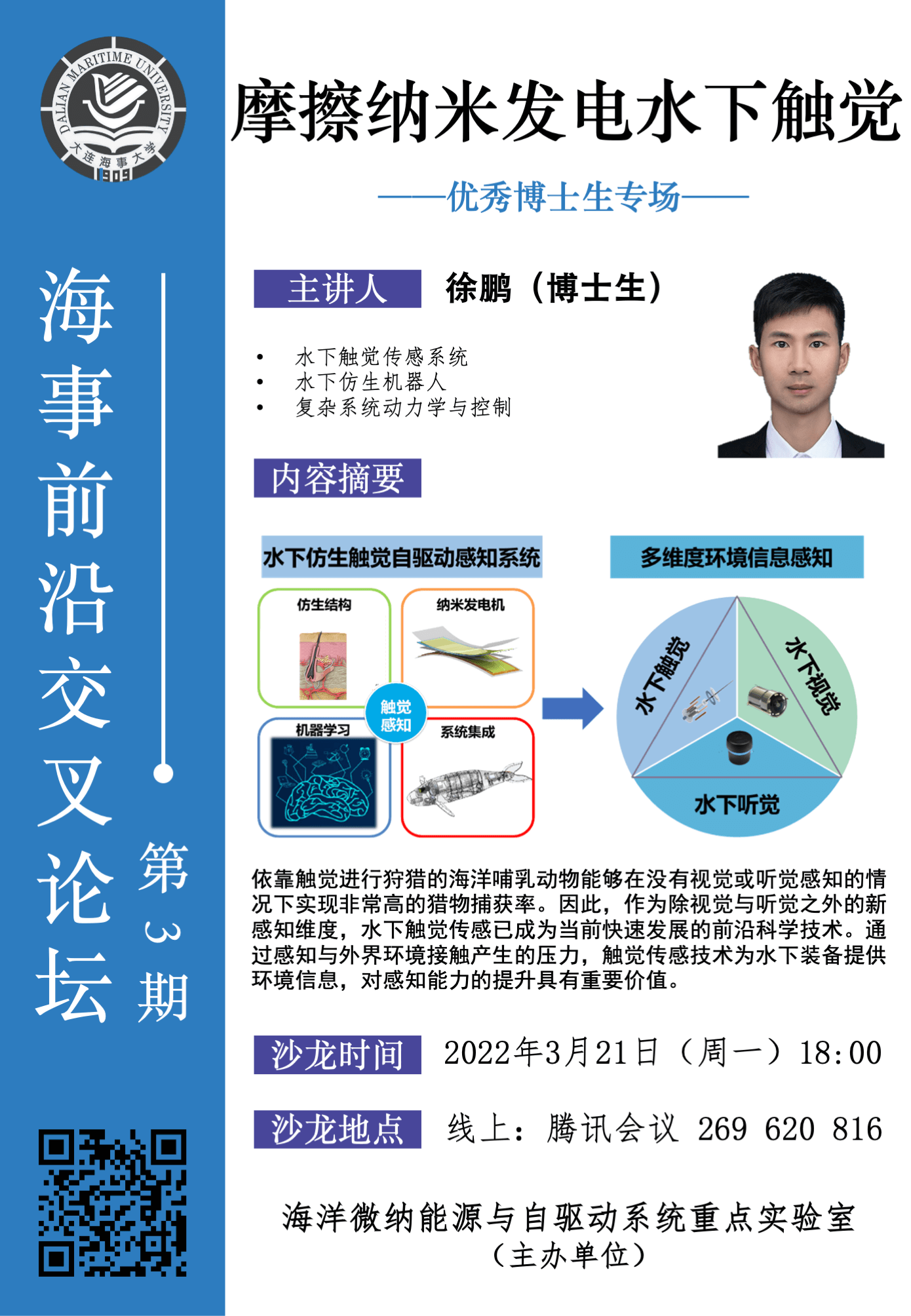 海事前沿交叉论坛第3期--优秀博士生专场,由徐鹏博士生主讲,内容主要包括对科研写作的经验分享。要点包括:句子结构、段落逻辑结构、如何进行结构描述(空间顺序)、如何进行过程描述(时间顺序)、情况-问题-解决方案-讨论等。