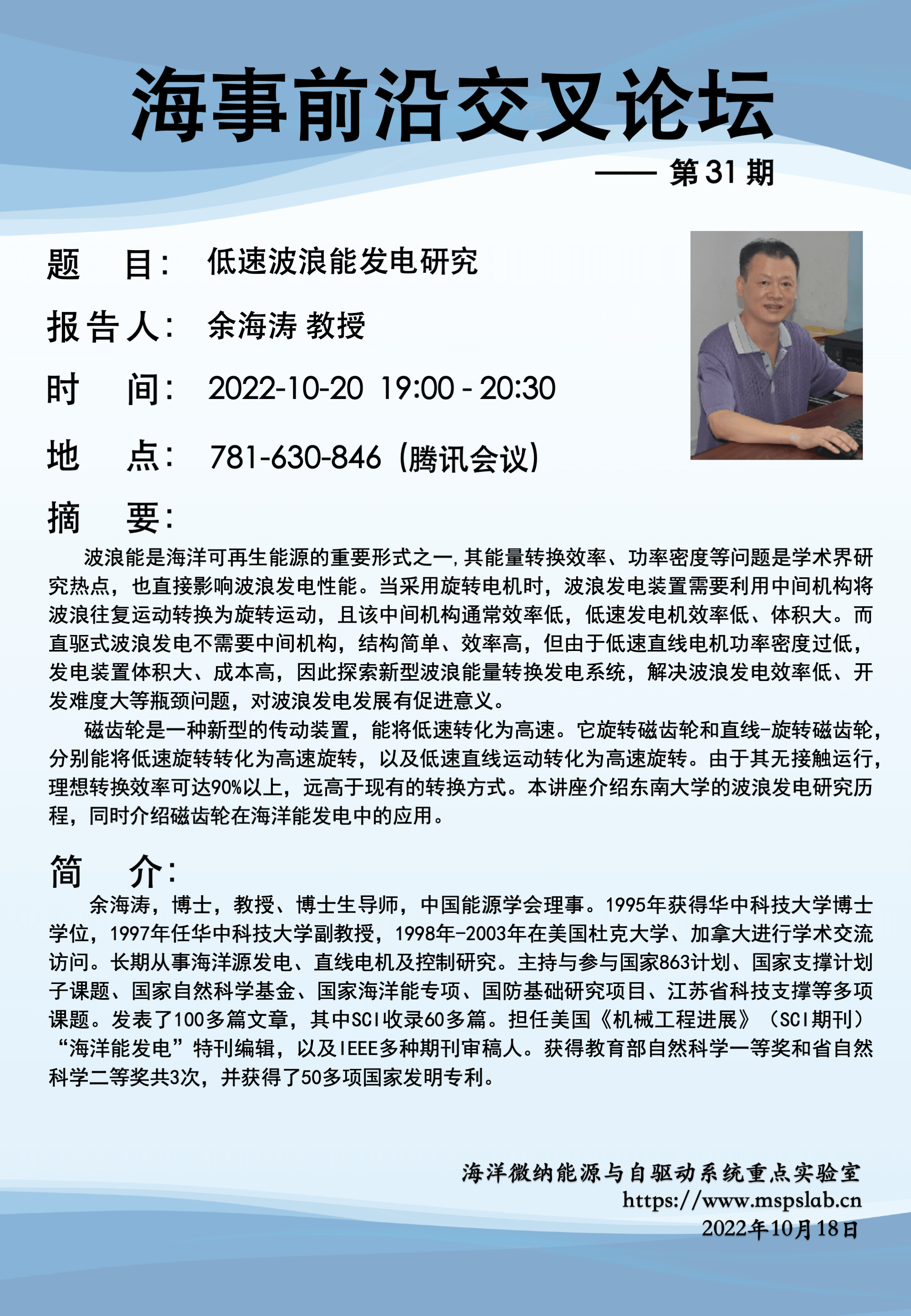 波浪能是海洋可再生能源的重要形式之一,其能量转换效率、功率密度等问题是学术界研究热点,也直接影响波浪发电性能。当采用旋转电机时,波浪发电装置需要利用中间机构将波浪往复运动转换为旋转运动,且该中间机构通常效率低,低速发电机效率低、体积大。而直驱式波浪发电不需要中间机构,结构简单、效率高,但由于低速直线电机功率密度过低,发电装置体积大、成本高,因此探索新型波浪能量转换发电系统,解决波浪发电效率低、开发难度大等瓶颈问题,对波浪发电发展有促进意义。磁齿轮是一种新型的传动装置,能将低速转化为高速。它旋转磁齿轮和直线-旋转磁齿轮,分别能将低速旋转转化为高速旋转,以及低速直线运动转化为高速旋转。由于其无接触运行,理想转换效率可达90%以上,远高于现有的转换方式。本讲座介绍东南大学的波浪发电研究历程,同时介绍磁齿轮在海洋能发电中的应用。