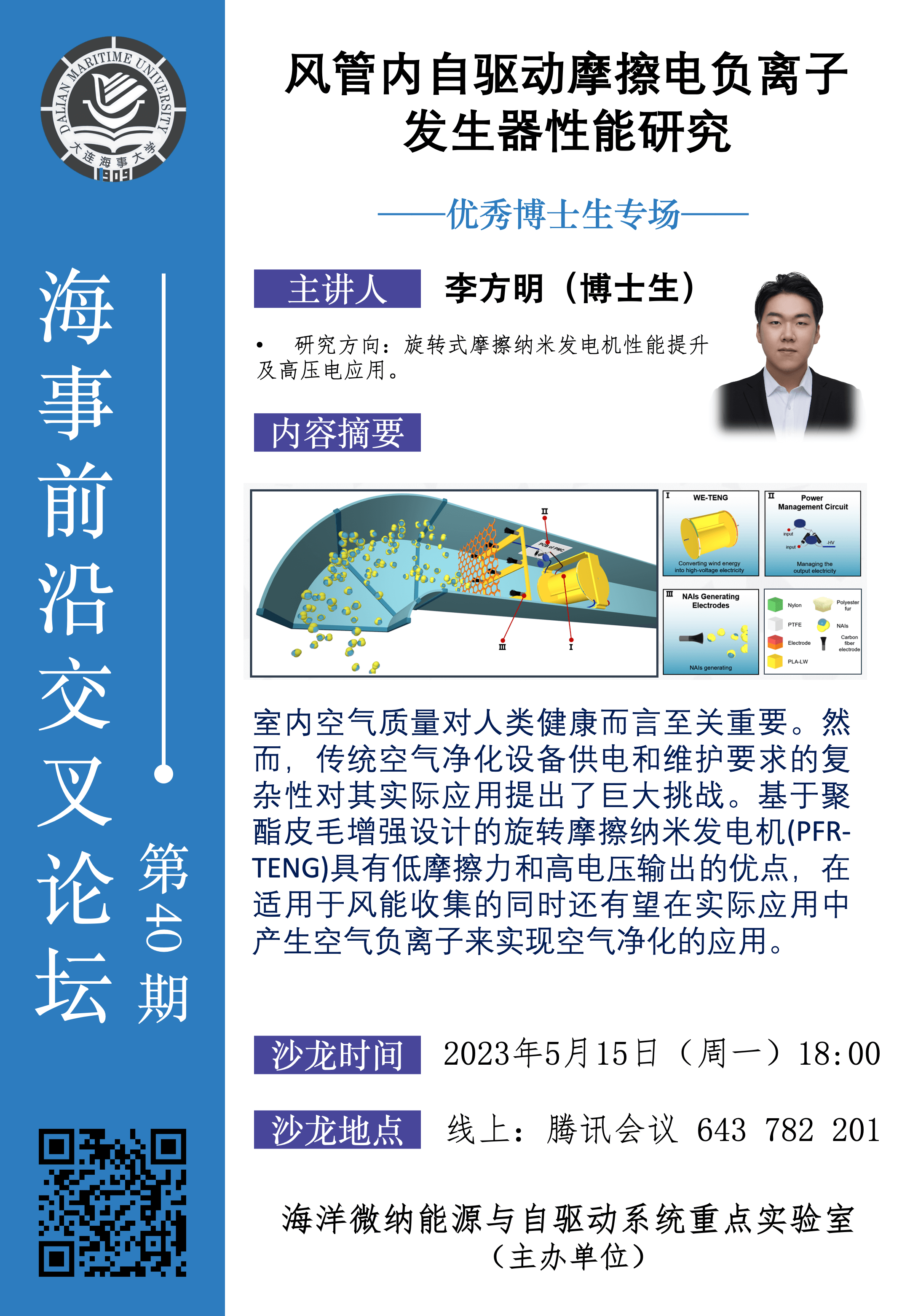 [资源分享] 李方明博士生:风管内自驱动摩擦电负离子发生器性能研究|海事前沿交叉论坛第40期--优秀博士生专场