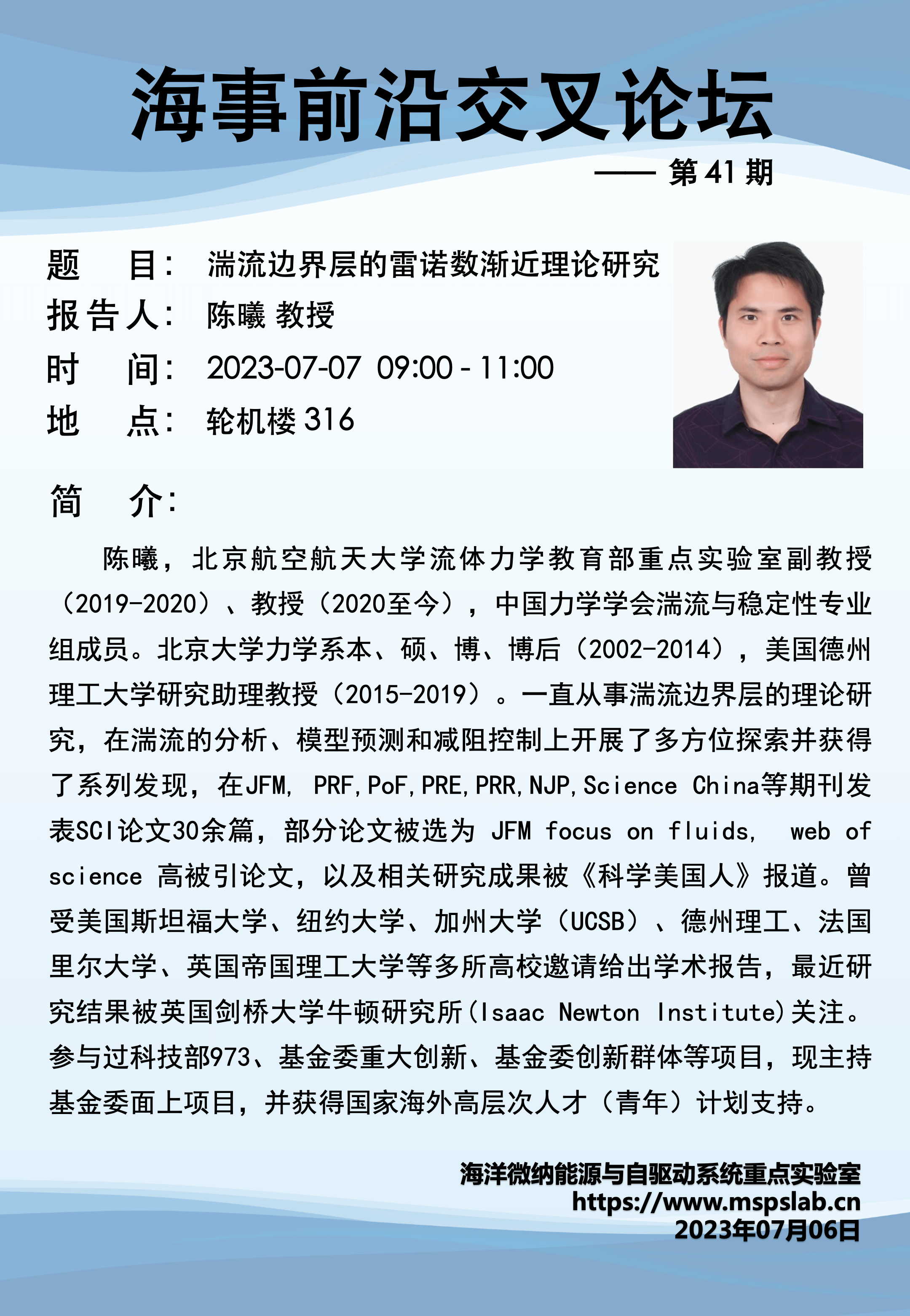 - 陈曦,北京航空航天大学流体力学教育部重点实验室副教授(2019-2020)、教授(2020至今),中国力学学会湍流与稳定性专业组成员。北京大学力学系本、硕、博、博后(2002-2014),美国德州理工大学研究助理教授(2015-2019)。一直从事湍流边界层的理论研究,在湍流的分析、模型预测和减阻控制上开展了多方位探索并获得了系列发现,在JFM, PRF,PoF,PRE,PRR,NJP,Science China等期刊发表SCI论文30余篇,部分论文被选为 JFM focus on fluids, web of science 高被引论文,以及相关研究成果被《科学美国人》报道。曾受美国斯坦福大学、纽约大学、加州大学(UCSB)、德州理工、法国里尔大学、英国帝国理工大学等多所高校邀请给出学术报告,最近研究结果被英国剑桥大学牛顿研究所(Isaac Newton Institute)关注。参与过科技部973、基金委重大创新、基金委创新群体等项目,现主持基金委面上项目,并获得国家海外高层次人才(青年)计划支持。