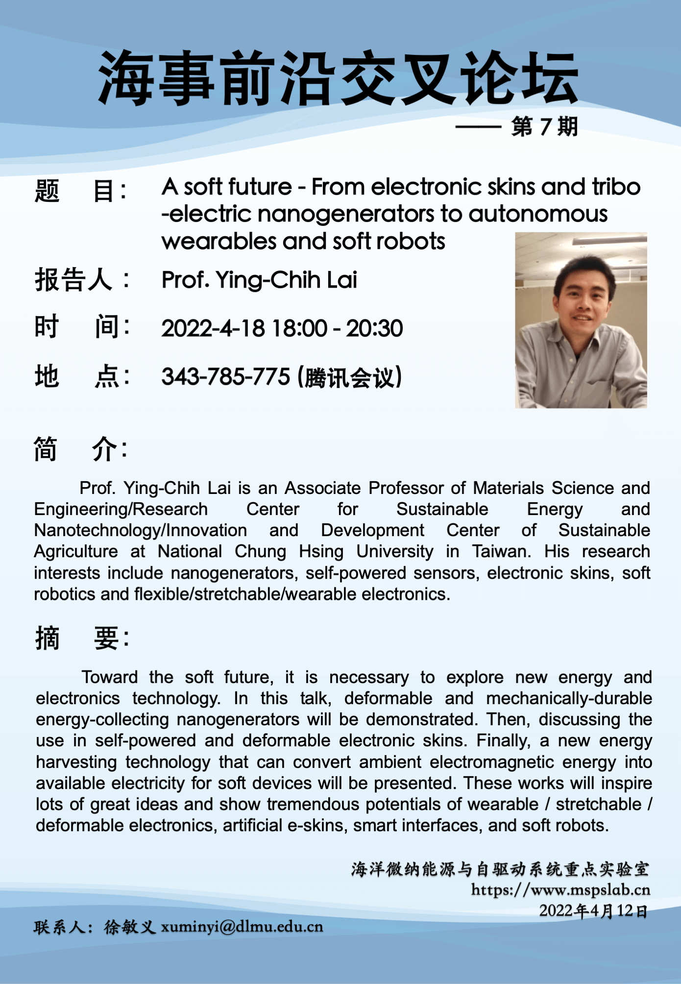 海事前沿交叉论坛第7期,由来自台湾中兴大学的賴盈至教授主讲,介绍在摩擦纳米发电机和电子皮肤领域取得的成果,并展示可穿戴/可拉伸/可变形电子设备、电子皮肤、人机交互和软体机器人领域的巨大潜力。