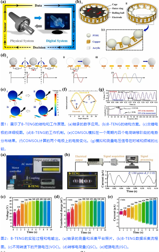 • 随着人工智能(AI)和数字化时代的到来,开发能够自我监测和智能诊断的轴承成为了一个富有意义但充满挑战的课题。轴承作为旋转机械中的关键支撑部件,在几乎所有的关键行业和日常应用中扮演着不可替代的角色,例如轮式车辆、风力涡轮机、航空发动机等。轴承的数字化双胞胎(Digital Twin)在物联网(IoTs)、大数据信息处理和AI建模分析的结合下,能够实现当前状态评估、过去问题的诊断以及未来发展的预测,并提供实时分析结果、模拟各种可能性以及提供全面的决策支持。然而,传统的传感技术在现代高度集成的机械中面临着传感器布置的挑战,而基于摩擦电纳米发电机(TENG)的传感器与轴承更为兼容,因为轴承内部容易找到两个具有往复运动的摩擦表面,无需外部侵入。因此,利用TENG实现自供电或自感测的摩擦电轴承已被频繁报道。在这项研究中,研究人员探索了一种AI赋能的轴承结构滚动摩擦电纳米发电机(B-TENG),旨在实现轴承磨损的条件监测和故障诊断。