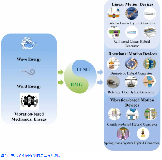 • 在这篇综述中,研究人员深入探讨了基于运动类型的电磁发电(EMG)和摩擦电纳米发电(TENG)技术的集成,重点分析了线性、旋转和基于振动的运动类型。他们发现,线性运动设备在捕获可预测的能量源(如海浪)方面特别有效,适用于海洋应用。而旋转运动设备在连续高速运动环境中表现出色,尤其是在风力发电系统中。相比之下,基于振动的设备能够捕获不规则和低频运动中的能量,为车辆和可穿戴电子设备提供了多功能性。研究还讨论了混合系统的最新进展,展示了材料和设计的进步,这些进步增强了能量采集和效率,同时也指出了包括机械磨损、环境影响和精确对准需求在内的挑战。