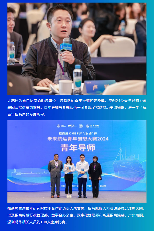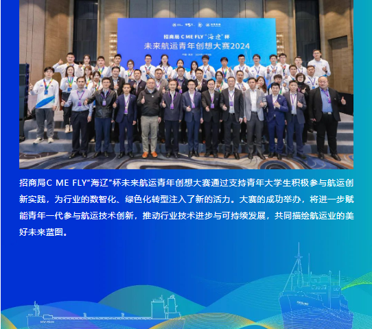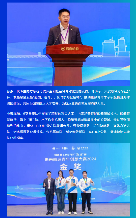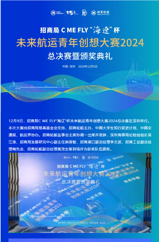 • 12月9日,招商局C ME FLY“海辽”杯未来航运青年创想大赛2024总决赛在深圳举行。本次大赛由招商局慈善基金会支持,招商轮船主办,中国大学生知行促进计划、中国交通报社、航运界协办。招商轮船监事会主席孙湘一出席并致辞,深圳海事局纪检组组长吴江涛、招商局发展研究中心副主任曲保智、招商港口副总经理李文波、招商工业副总经理梅先志、招商轮船副总经理黄茂生等到场并为获奖队伍颁奖。