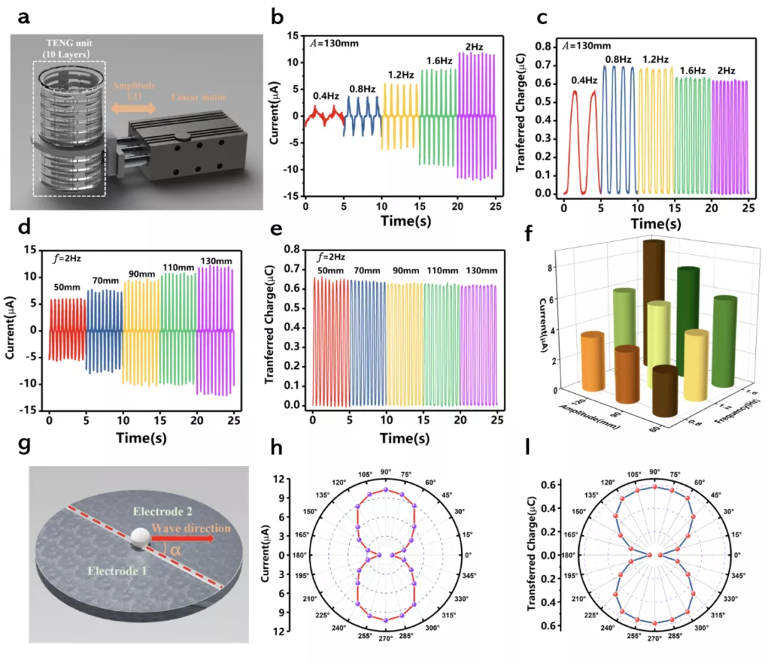 图2.10层堆叠发电单元在不同波浪条件下的发电性能测试 -(a)10层堆叠发电单元波浪模拟实验台;(b)不同波浪频率对短路电流的影响;(c)不同波浪频率对转移电荷量的影响;(d)不同波浪振幅对短路电流的影响;(e)不同波浪振幅对转移电荷量的影响;(f)不同波浪频率和振幅对短路电流影响3D示意图;(g)波浪方向与电极对夹角α示意图;(h)不同波浪方向下发电单元的短路电流;(i)不同波浪方向下发电单元的转移电荷量;