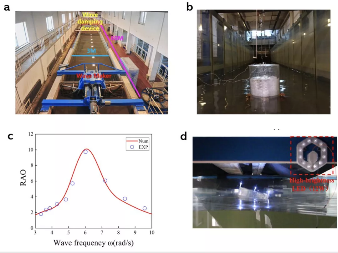 图5.自供能航标波浪水池实验 -(a)用于开展波浪实验的海洋波流水槽照片;(b)自供能航标实验照片;(c)自供能航标幅频相应算子模拟值与实验值对比图;(d)自供能航标在波浪驱动下为12W LED灯环供电照片;