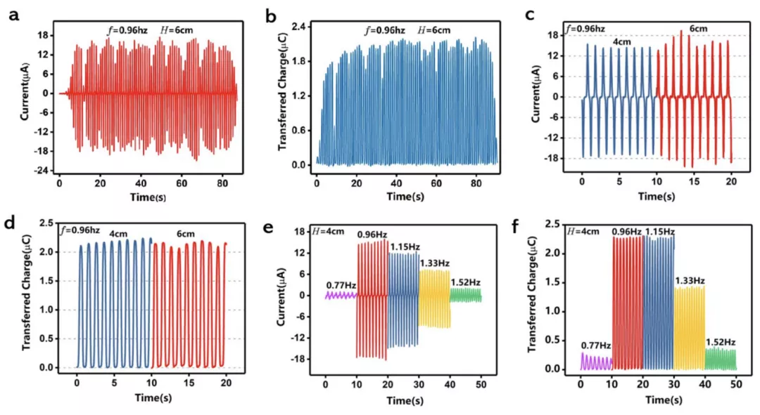 图6.自供能航标对水动力参数敏感性研究 -(a)波高为6cm,波浪频率0.96Hz时自供能航标短路电流数据图;(b)波高为6cm,波浪频率0.96Hz时自供能航标转移电荷量数据图;(c)波浪频率0.96Hz,不同波高对输出短路电流的影响;(d)波浪频率0.96Hz,不同波高对转移电荷量的影响;(e)波高为4cm,不同波浪频率对输出短路电流的影响;(f)波高为4cm,不同波浪频率对转移电荷量的影响;