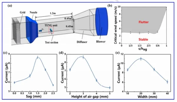 图2. 风洞中TENG单元的结构优化实验 -(a)实验装置示意图(b)不同膜垂度TENG单元的临界风速(c-e)输出电流与垂度,空气间隙和膜宽度的关系