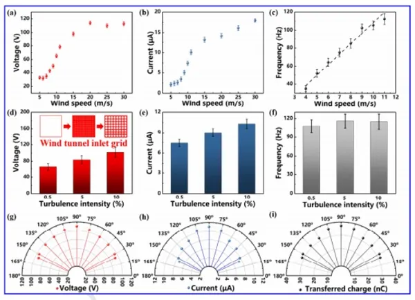 (d-f)开路电压,短路电流和膜颤振频率与湍流度的关系(g-i)TENG单元的开路电压,短路电流和转移电荷量与风向的关系