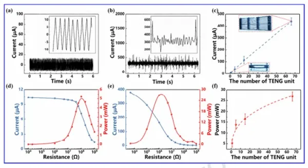 图4. TENG风屏障的发电性能 -(a)TENG单元的输出电流(b)由66个TENG单元组成的TENG风屏障的输出电流(c)输出电流随TENG单元个数变化曲线(d)TENG单元外加电阻的输出电流与功率的变化曲线(e)TENG风屏障外加电阻的电流与功率的变化曲线(f)功率随TENG单元个数变化曲线