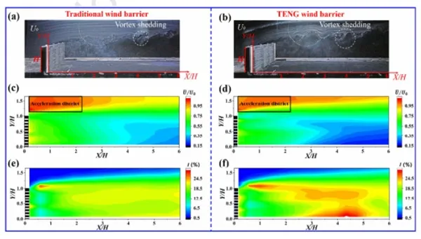 (c,d)传统风屏障和TENG风屏障后部的速度云图对比(e,f)传统风屏障和TENG风屏障后部的湍流度云图对比
