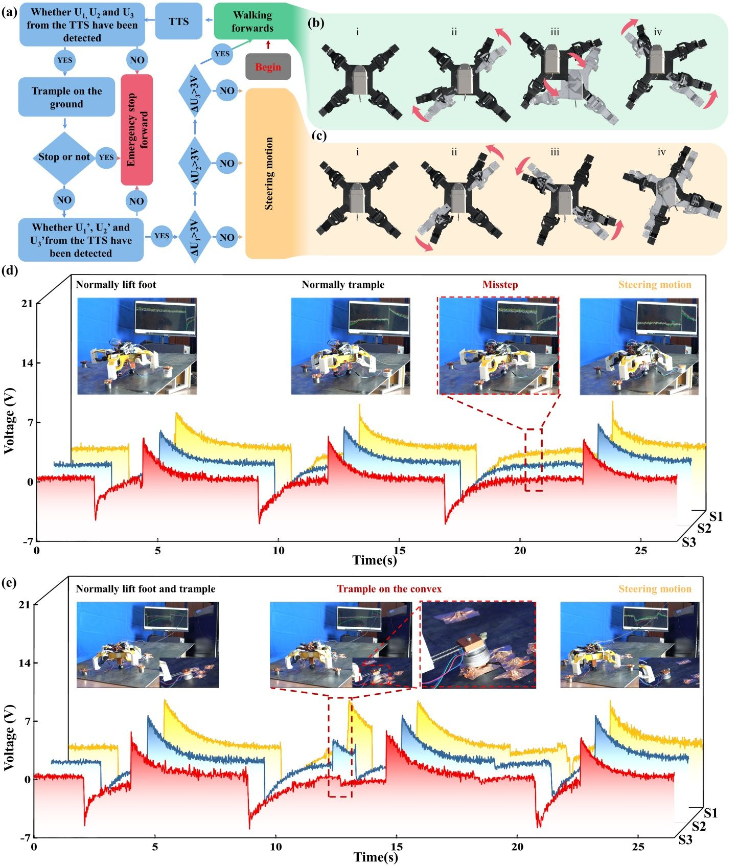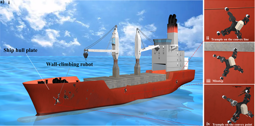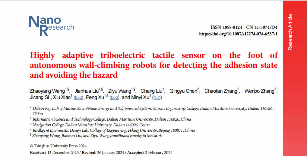徐敏义教授团队针对腿足式磁吸附爬壁机器人无法感知磁吸附状态的问题,提出了一种用于腿足式爬壁机器人的足部触觉传感器,采用3D打印外壳、触觉滑块和三个等距传感单元组成的结构设计实现了既不影响机器人足部的正常吸附,又能够感知机器人足部的磁吸附状态。本文开展了触觉传感器在触觉滑块不同的滑动频率和滑动深度情况下的性能实验,实验表明触觉传感器能够监测触觉滑块的滑动深度并控制LED信号灯。此外,在监测机器人足部吸附状态的演示实验中,摩擦电触觉传感器对各种铁磁壁面具有较强的适应性,并建立了机器人步态控制系统,验证了摩擦电触觉传感器的反馈控制能力。结果表明,安装了摩擦电触觉传感器的机器人能够识别爬行壁上的危险区域并自主规避危险。