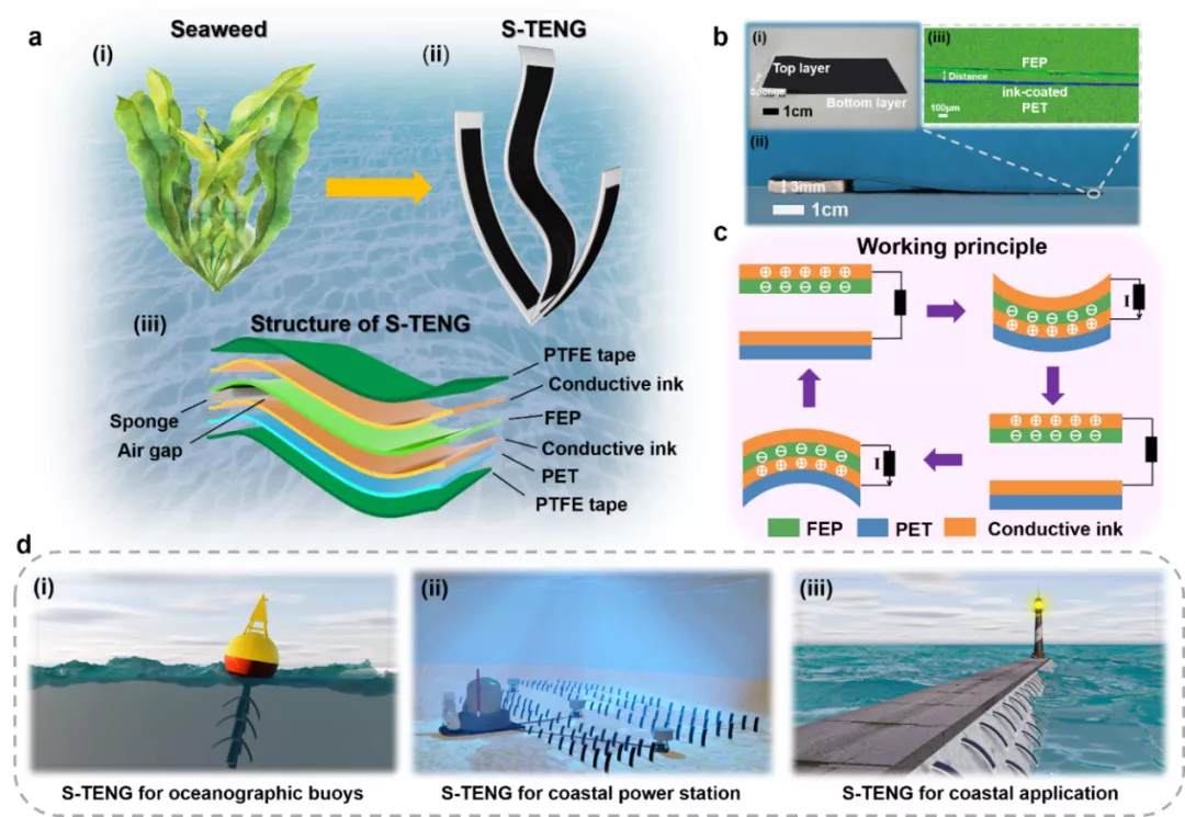 该团队选择由导电油墨覆盖的聚对苯二甲酸乙二醇酯(PET),导电油墨覆盖的氟化乙烯丙烯共聚物(Fluorinated ethylene propylene, FEP)和两片聚四氟乙烯膜(PTFE)制成仿海草摩擦纳米发电机(S-TENG),灵活的柔性结构使其能在沿岸水面、水中和水下实时将波浪能转化成电能。