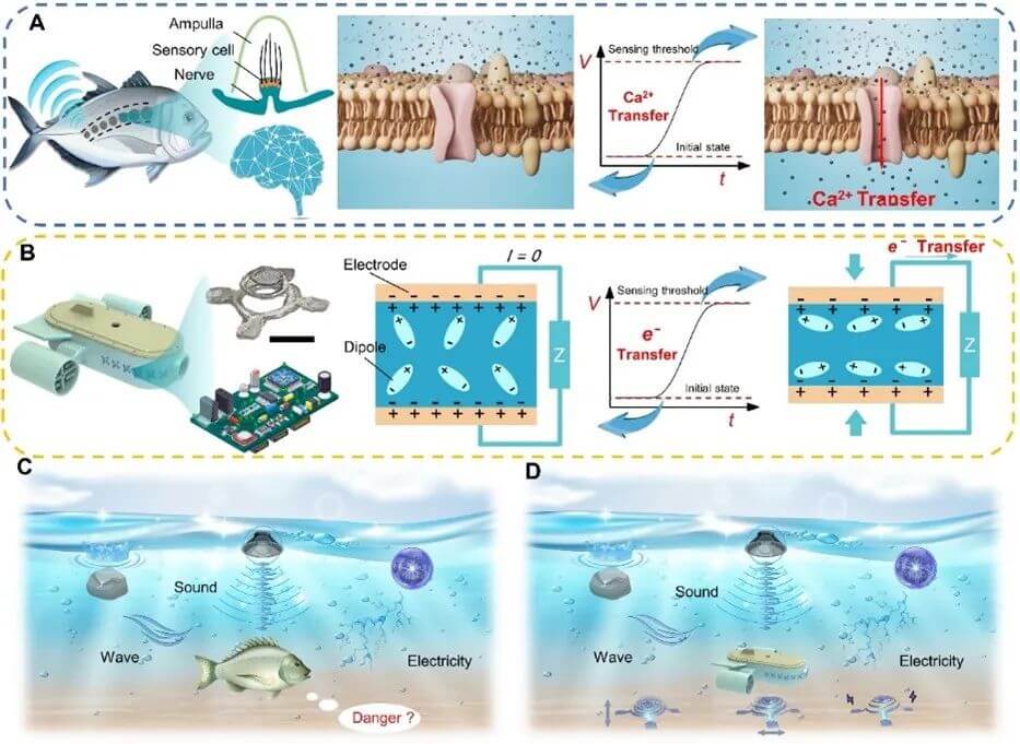 图1. 仿生结构及原理。(A)鱼类侧线系统的结构和传感方法。鱼类通过周围皮孔检测水流、声音和电等信号,触发神经细胞离子通道的开放和兴奋性递质的释放,从而产生感觉反应。(B) AFLN系统结构和传感方法。插图展示了其在水下机器人技术中的潜在应用。比例尺:2 毫米。(C) 鱼类可以借助侧线系统感知微弱的水流变化、声信号和水下电场。(D) 水下机器人还可以借助AFLN系统的不同响应来识别水波、水声和水下电场。