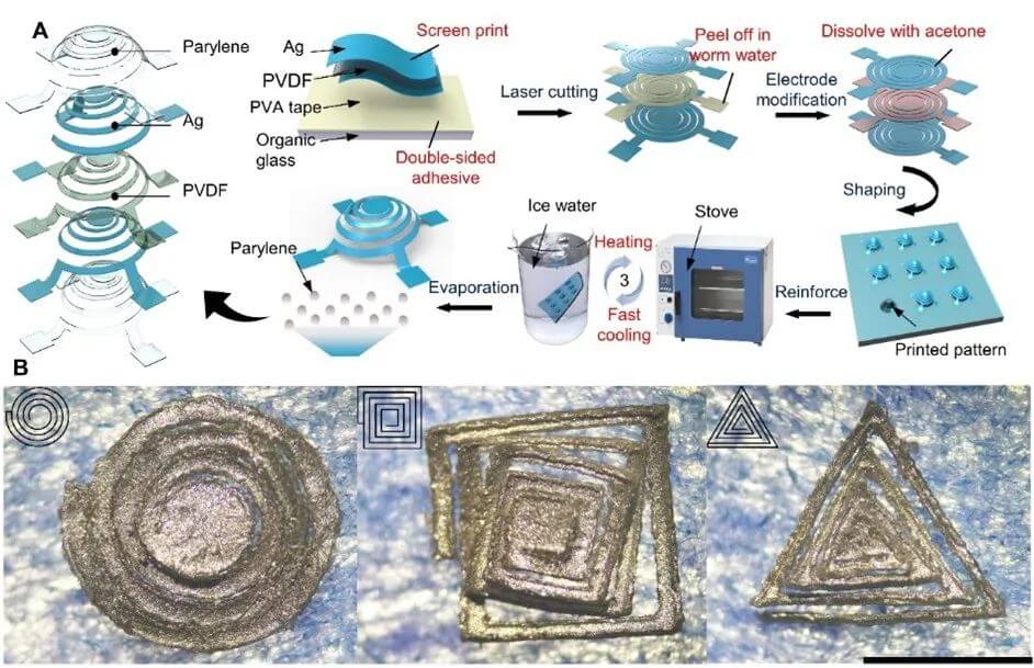 图 2. AFLN 的制造过程。(A) AFLN 的准备流程图。(B) 激光切割后不同图案的比较。光滑的圆形形状更加稳定。比例尺:2 毫米。