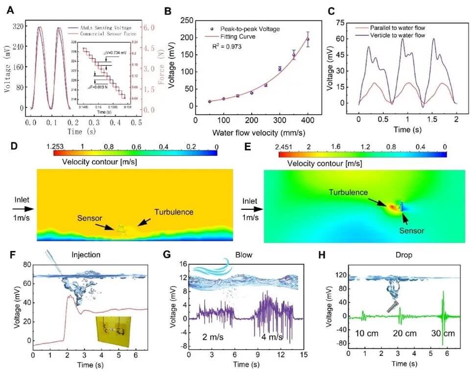 图 3.AFLN 对水压的响应。(A) AFLN 与力传感器串联情况下的力和输出电压比较。(B) 不同水流速度下的输出电压。(C) 不同方向水流下输出电压的比较。(D) 传感器与流场平行时的计算流体动力学 (CFD) 模拟。(E) 传感器垂直于流场时的 CFD 模拟。(F-H) AFLN 对不同弱机械刺激的反应。用橡胶头滴管在附近注入水(F),用吹风机吹水面(G),将小螺丝从不同高度扔入水中(H)。