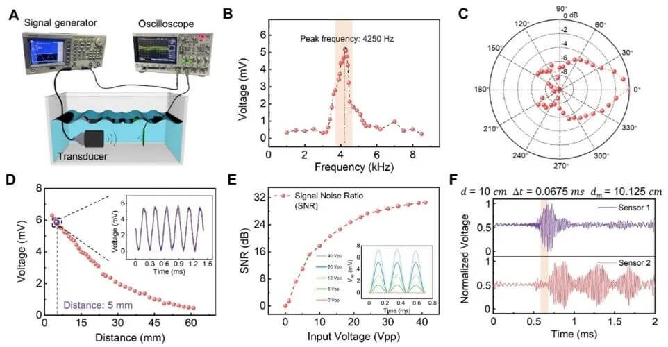 图 4. AFLN 的声学特性。(A)高频测试实验装置示意图。(B) 不同声频下 AFLN 的输出电压。谐振频率约为4250 Hz。(C) 不同方向模式。(D) 不同声源距离处 AFLN 的输出电压。(E) 不同输入能量下 AFLN 的信噪比和输出波形。(F) 使用 AFLN 对声波响应的时间差进行测距。