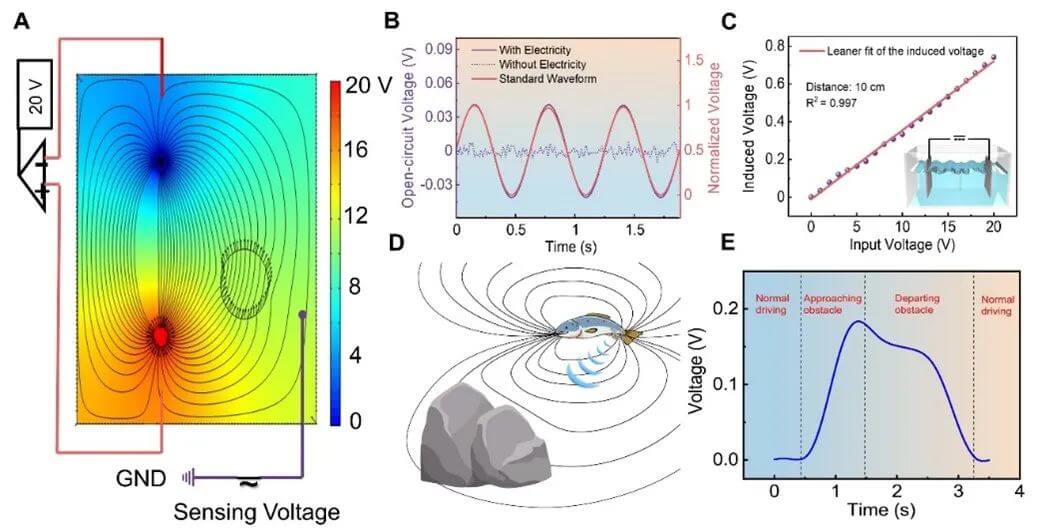 图5. AFLN对水下电场的特性。(A)电传感器原理示意图。(B) 电传感器在平行板电场作用下可以获得与标准水波(红色)相同的幅值相位信息(蓝色)。当去除电场并施加标准波时,电传感器没有相应的响应(蓝色虚线)。(C) AFLN 对基于平行板的水下电场输入电压的响应。(D) AFLN 通过电场检测静止障碍物。(E) 避障期间的 AFLN 输出。