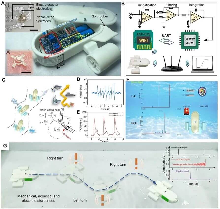 图 6. AFLN 系统在机器人避障中的应用演示。(A) 配备 AFLN 系统的 AUV 照片。(B)系统工作原理。控制系统由信号采集、处理、放大、传输等模块组成,可实现AFLN传感器对水下机器人的自动控制。(C) AUV系统导航策略和轨迹。插图为碰撞角度和左右差速获取方法示意图。(D) 感知动态波环境中的机械刺激。(E) 同时应用波和电场刺激。(F)自主避障电压显示程序。实时信号由红线表示,而电压电位由蓝线表示。(G) AUV 避障应用示意图。插图展示了从系统获取的实时信号。