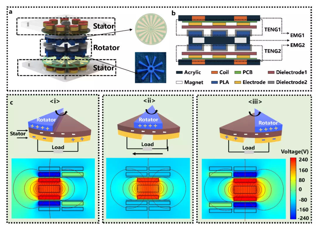 图1:IP-HG的结构设计。(a) 设计的复合发电机的示意图,它主要由两部分组成,两个旋转径向电极结构模式的TENG单元和两个EMG单元。(b) IP-HG的材料组成。(c) IP-HG的工作机制示意图。