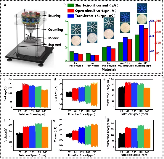 图2:材料和单元对TENG电输出的影响。(a) IP-HG的实验平台的照片。(b)用不同介质材料制造的TENG的开路电压、短路电流和转移电荷。(c) 单个TENG的Voc,(d) Isc,(e) Qsc。(f) 两组TENG并联的Voc,(g) Isc, (h) Qsc。