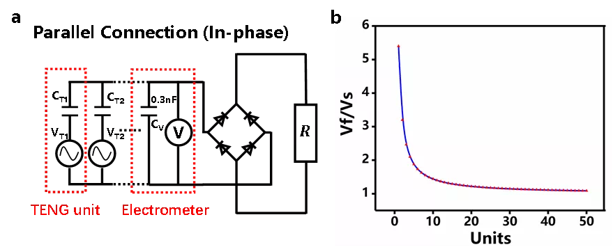 图3:电压的实际值和测试值之间的关系。(a)摩擦纳米发电机的等效电路图;(b)同相位并联单元的数量与Vf/Vs之间的关系。
