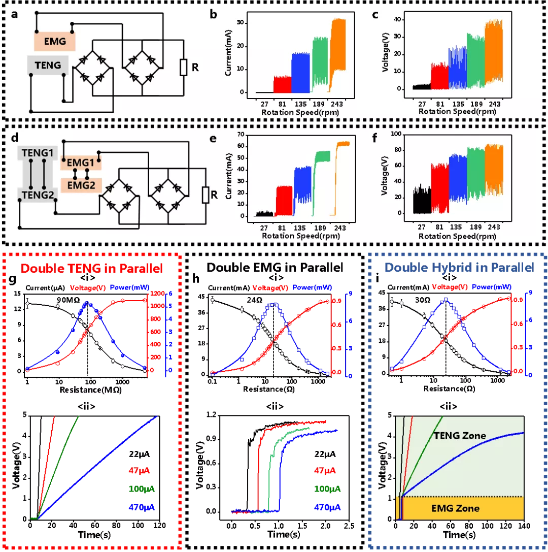 图4:IP-HG的输出性能。(a) 单个TENG和EMG分别整流后并联的等效电路示意图以及直流电流(b)和电压(c)的输出性能。(d) 两组TENG和EMG同相位并联后分别整流再并联的等效电路示意图以及直流电流(e)和电压(f)的输出性能。(g) 两台TENG并联后在不同电阻下整流的功率特性曲线(i)和(ii)对不同电容充电的能力。(h) 两个EMG并联后在不同电阻下整流的功率特性曲线(i),以及(ii)对不同电容器充电的能力。(i)两套TENG、EMG分别并联后整流后在不同电阻下并联的功率特性曲线(i)和对不同电容器充电的能力(ii)。