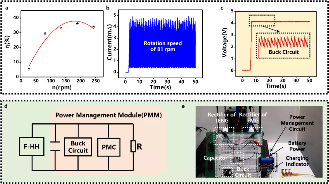 图5:IP-HG的演示。(a) IP-HG的效率。通过降压电路的稳定IP-HG电流(b)和电压(c)。(d) 带有电源管理模块(PMM)的IP-HG和(e)保持3个5W的直流灯泡串联的照明。
