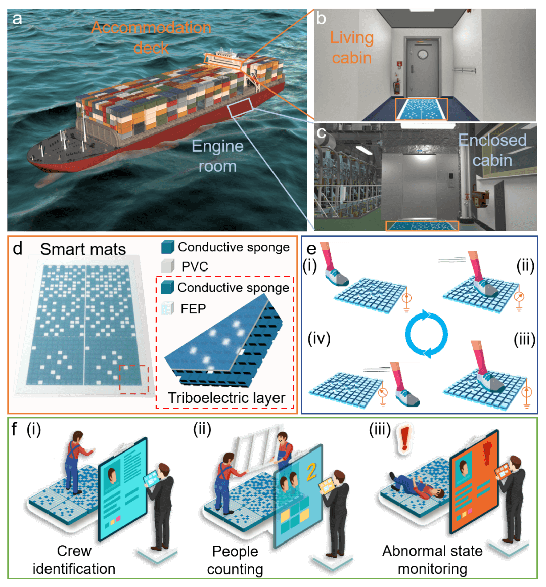 图1. 深度学习辅助的自驱动摩擦电智能地毯及其应用。(a) 智能地毯在海事行业的潜在应用。(b-c) 起居舱和封闭舱的放大视图,应监控船员以防疫和人身安全。(d) 3×2 排列组装的摩擦电智能地毯,放大图显示了由导电海绵和 FEP 制成的摩擦电层。(e) 摩擦电智能地毯单元的工作机制。(f) 基于 AIoT 传感系统的应用。