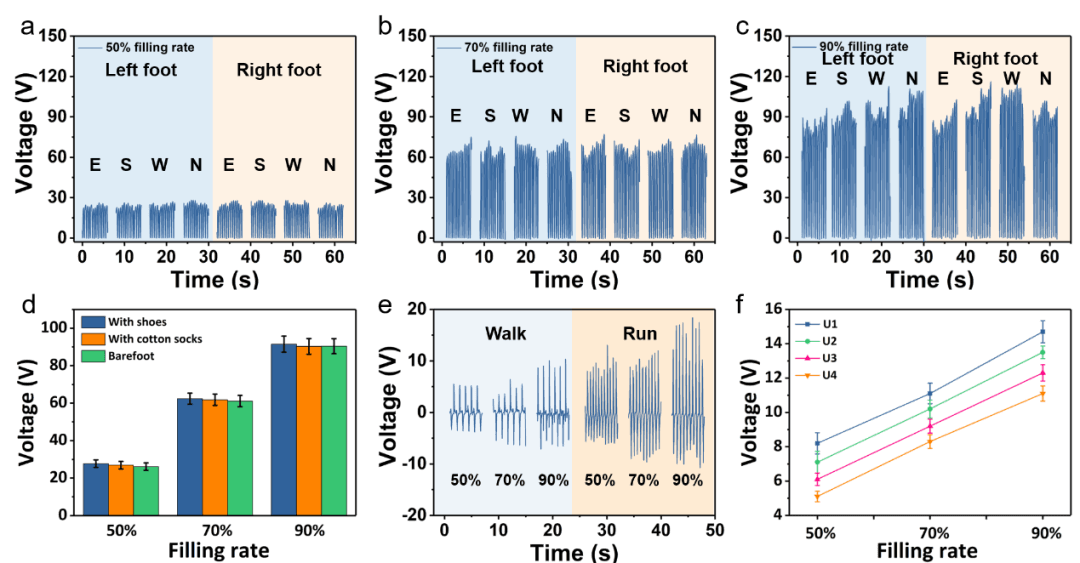 图 2. 智能地毯单元的特性。(a)50%、(b)70%和(c)90%的电极填充率(从左右脚四个方向)反复踩踏智能地毯单元产生的电压信号。(d) 同一用户佩戴的不同台阶材料对平均输出电压的影响。(e) 用户行走和跑步对不同填充率的智能地毯单元电压输出的影响。(f) 不同用户对智能地毯单元输出电压的影响。