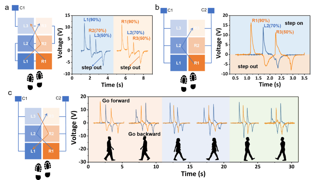 图 3. 地垫单元串并联的输出特性。(a) 六个串联的智能地毯单元的示意图及其输出特性。(b) 六个并联智能地毯单元的示意图及其输出特性。(c) 不同用户前后行走产生的信号的特征。