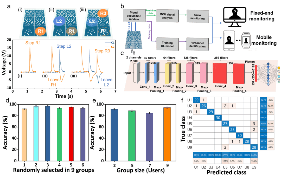 图 4. 与用于数据分析的深度学习模块集成的智能地毯。(a) 实时轨迹跟踪和位置传感。(b) 用于人员识别的智能地毯监控系统示意图。(c) 卷积神经网络 (CNN) 训练模型的详细结构。(d) 5 个随机选择的用户的 6 个分组的分类精度 (e) 4 个组大小从 2 增加到 5、7 和 9 个用户的数据集的分类精度。(f) 9 个用户的人员识别混淆矩阵。