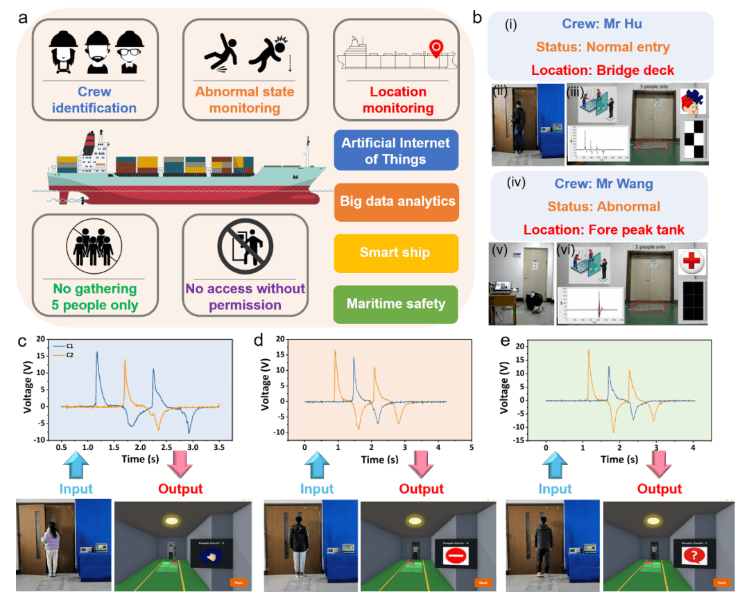 图 5.智能地毯的应用演示。(a) 船上智能地毯系统的功能示意图。(b) 不同用户在实时定位、人员识别和状态监控方面的演示。(c-e) 在虚拟显示器中演示智能地毯系统的轨迹跟踪、人数统计和人员识别。