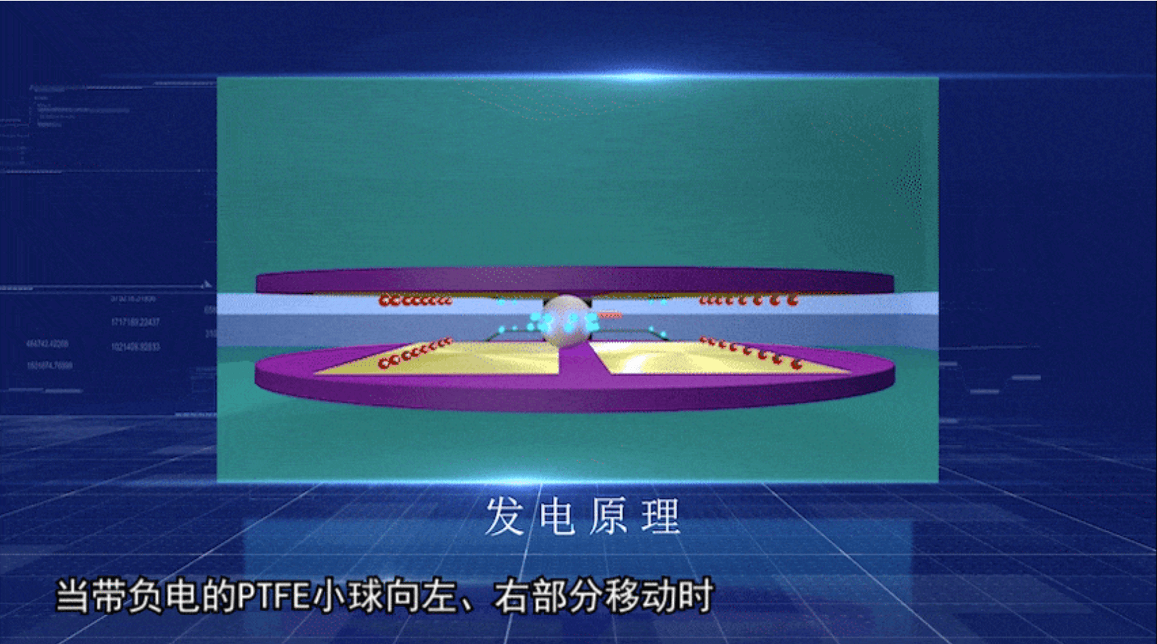- 在发电原理上,波浪能浮标内部类似于“三明治式”结构,在海浪的激励下,PTFE(聚四氟乙烯)小球与铝电极接触并在两对铝电极之间自由移动时,由于摩擦起电,PTFE小球会带负电荷。当带负电的PTFE小球向左、右部分移动时,通过静电感应使得左、右电极上产生正电荷,因此在电路中会产生交变电流。