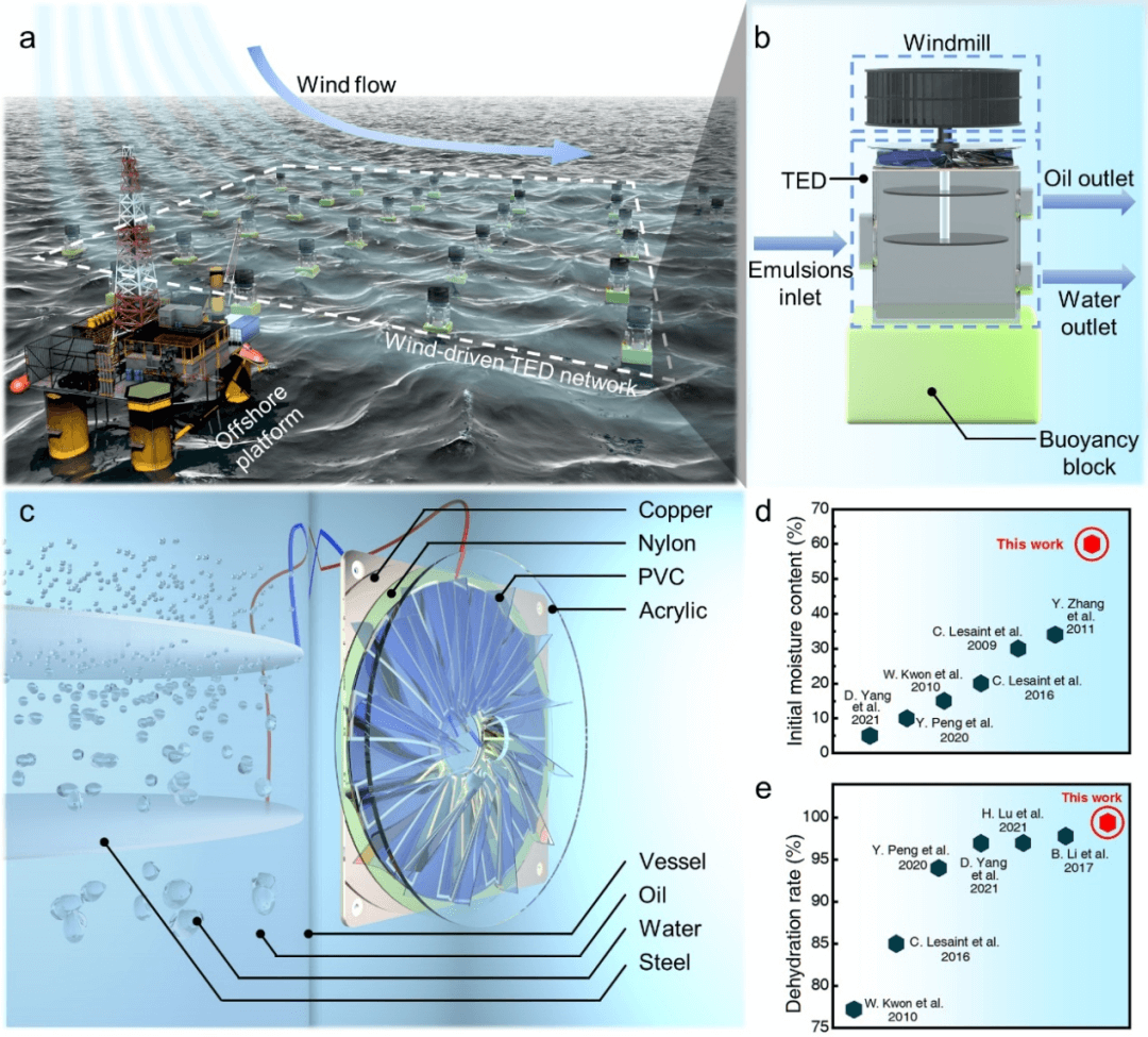 图1. 用于分离油包水乳液的TED的设计与应用.a)用于原油处理的风力驱动TED网络。b)风力驱动TED装置的结构示意图。c)TED原理图。d)初始含水率和e)最终脱水率与其他工作的比较。