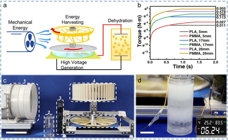 图6. 用于分离油包水乳液的风力驱动TED的演示。a)风力驱动TED的实验室台和能量循环的示意图。b)在 5mm、17mm和26mm的间距下驱动 FR-TENG时的扭矩变化。c)风力驱动TED的实验室台照片。1到5分别表示风扇、TED的容器、风速计、风轮和FR-TENG(图中比例尺长度:10 厘米)。d)用风力驱动的电源分离油包水乳液的照片(图中比例尺长度:2厘米)。