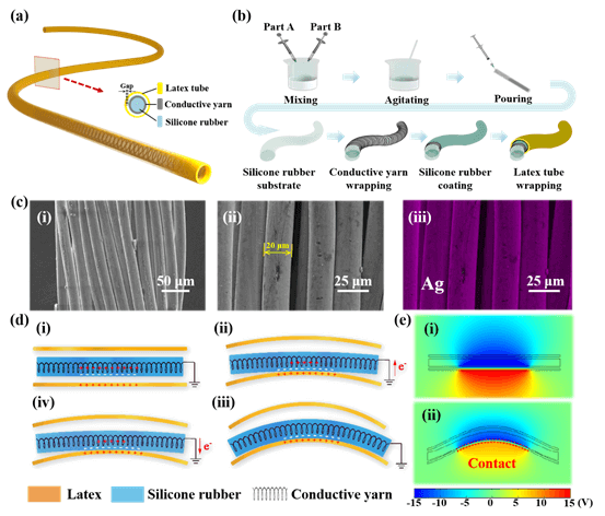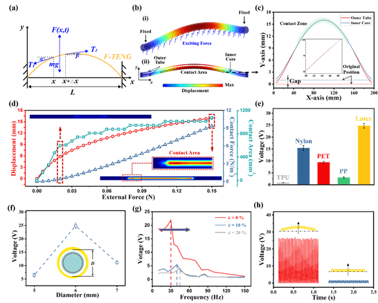 近日,大连海事大学徐敏义教授团队针对以上问题,设计了一种基于芯鞘结构的柔性纤维状摩擦纳米发电机(Fiber-shaped Triboelectric Nanogenerator, F-TENG),旨在实现对于设备振动的自驱动感知。F-TENG因其良好的柔韧性及适应性,可满足曲面结构的振动感知需求。在本项研究中,首先通过力学模型及仿真分析,对F-TENG的形变特性进行分析,得出了影响TENG发电性能的关键参数。在此基础上,通过实验方法,对影响F-TENG振动感知特性的关键参数进行了优化。实验结果表明经过优化后的F-TENG可有效感知0.1至100 Hz的宽频振动,且即使经过约45000次连续振动激励后其输出电信号幅值和频率仍可保持稳定。在应用于实际生产中的柴油机振动监测时,其振动频率感知误差相较于商用振动传感器仅为0.32%。最后,结合深度学习方法成功地实现了对不同管道系统运行状态的识别,识别准确率可达97.87%。