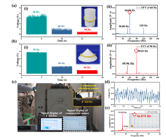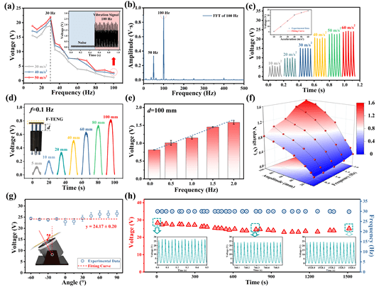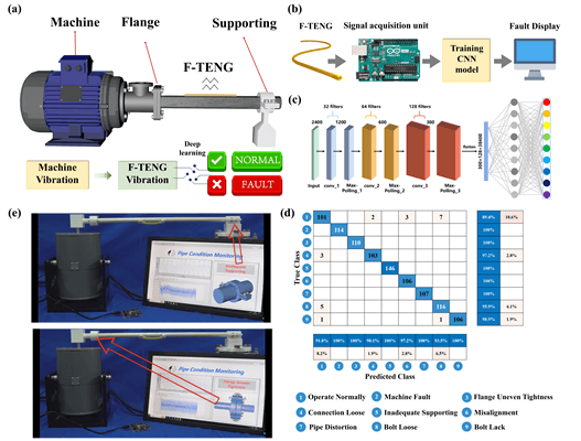 - 综上所述,这项研究提出了一种柔性、高适应性纤维状摩擦纳米发电机,用于自驱动振动感知。结合力学模型及仿真分析,对传感器的感知机理进行了分析。实验结果表明经过优化后的F-TENG可感知0.1至100 Hz范围内机械振动,同时可实现对于曲面结构振动感知需求。当应用于实际柴油机时,其相较于商用振动传感器,振动频率感知误差仅为0.32%。最后,结合深度学习方法成功实现了对不同管道系统运行状态的识别,识别准确率可达97.87%。总之,新设计的F-TENG具有适应性强、经济简便等优势,为实现未来自驱动振动感知提供了一种新的解决方案。