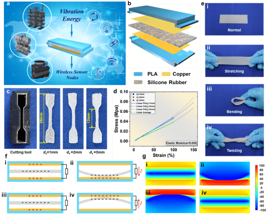 图1 HSR-TENG的应用场景、结构、变形特性及工作原理。(a)HSR-TENG的应用场景;(b) HSR-TENG的结构;(c)标准刀具及不同厚度硅胶柔性带试样;(d)硅胶柔性带的弹性模量;(e) 柔性带在(i)正常、(ii)拉伸、(iii)弯曲和(iv)扭曲状态下的照片;(f)HSR-TENG的工作原理;(g) HSR-TENG的模拟电势分布。