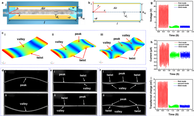 图2硅胶柔性带的运动特性。用于分析柔性带运动特性的(a)三维和(b)二维坐标系;(c)柔性带在(i)一阶、(ii)二阶、(iii)三阶振动模式的仿真结果;高速摄像机捕捉到硅橡胶条在(d)一阶、(e)二阶、(f)三阶振动模式下的运动响应;不同振动模式下(g)开路电压,(h)短路电流,(i)转移电荷。