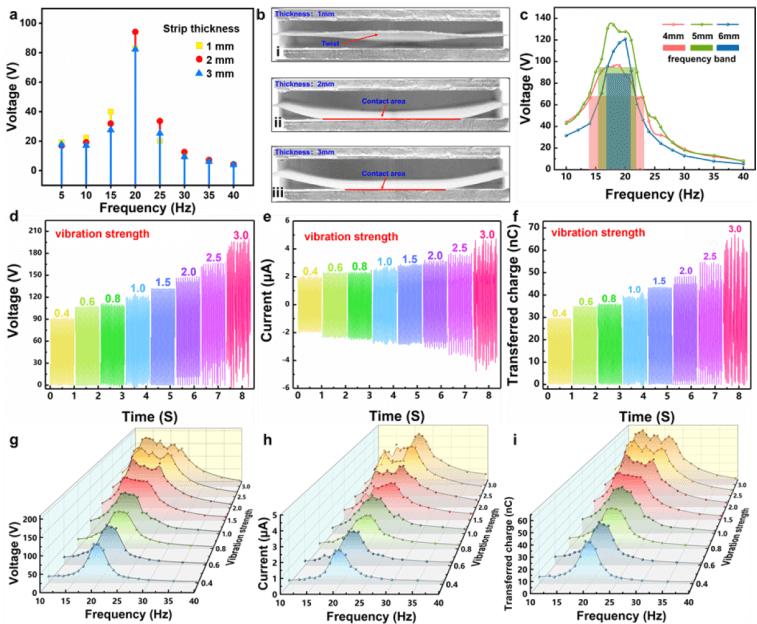 图3 HSR-TENG在柔性带非线性变形下的输出性能。(a)柔性带长度为10 cm,厚度为1-3 mm的HSR-TENG的开路电压;(b)柔性带厚度为(i)1mm,(ii)2mm,(iii)3mm的柔性带的运动响应;(c)不同电极间距的HSR-TENG的开路电压和电压带宽;一阶振型振动频率下不同振动强度作用下的(d)开路电压、(e)短路电流和(f)转移电荷量;不同振动强度下HSR-TENG的(g)开路电压,(h)短路电流和(i)转移电荷量。