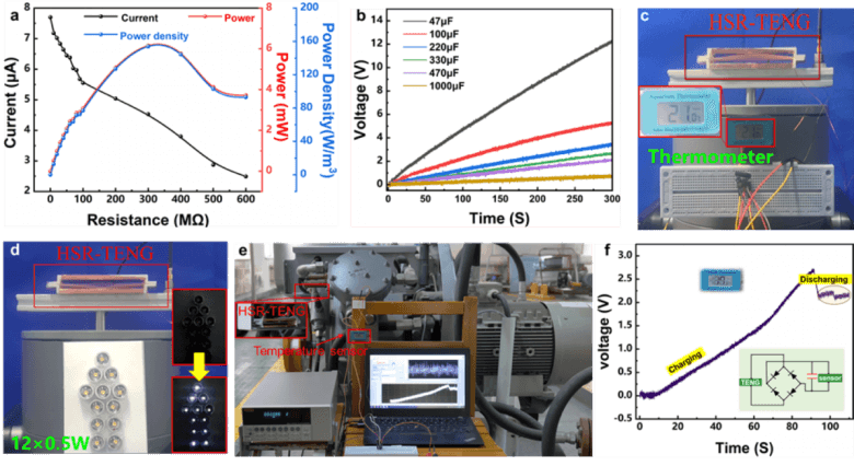 图片图4 HSR-TENG的振动能量捕获演示。(a)HSR-TENG的输出电流、计算功率和功率密度随匹配电阻的变化;(b) 300s时间内HSR-TENG对不同电容的充电电压曲线;(c)HSR-TENG为商用温度传感器供电演示;(d)HSR-TENG为12盏0.5W的LED灯供电演示;(e)安装在实际空压机上的HSR-TENG为温度传感器持续供电;(f)温度传感器连续供电时电容充放电曲线。