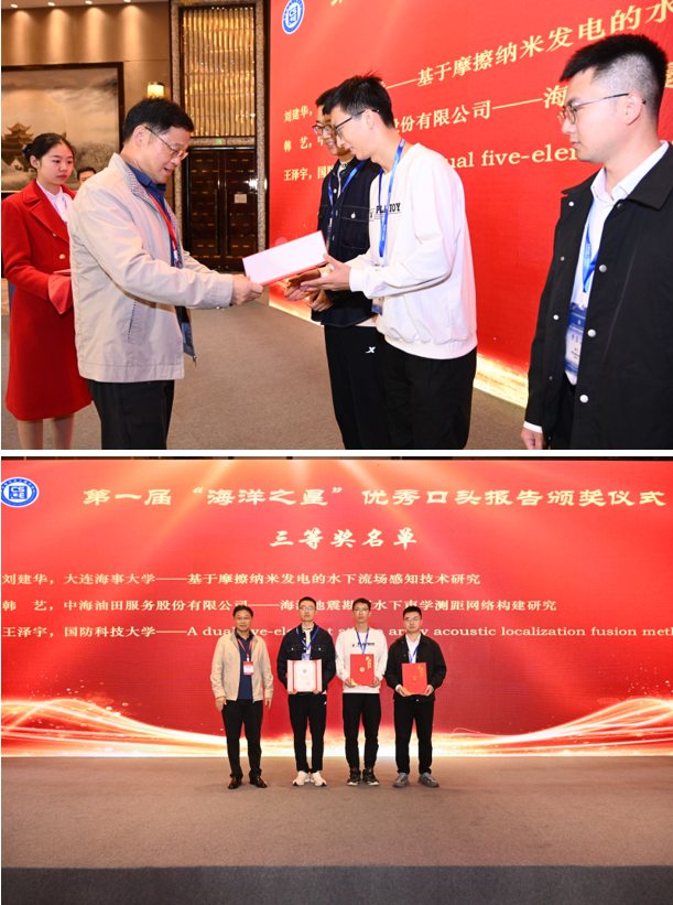 - 大会同期举办了第一届“海洋之星”评选活动,实验室博士生刘建华所作的口头报告“基于摩擦纳米发电的水下流场感知技术研究”,荣获优秀口头报告三等奖,中国工程院笪良龙院士为其颁奖。