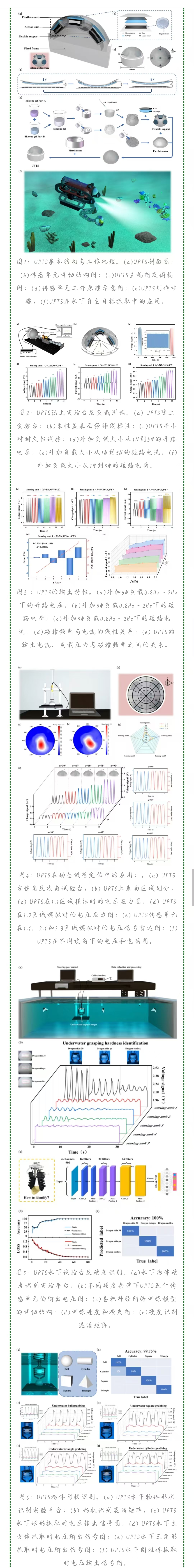 - 近日,大连海事大学徐敏义教授团队针对如何精准控制水下爪夹抓取力的问题,提出了一种用于水下机器人爪夹的基于液态金属型摩擦纳米发电机的三维触觉掌心传感器(adistributed liquid metal-based three-dimensional biomimetic underwater triboelectric palm-like tactile sensor ,下称UPTS)。该传感器由柔性盖,5个独立的传感单元,柔性支撑以及3D打印的固定壳体组成,本文开展了关于UPTS的陆上和水下实验,其中陆上实验的结果表明UPTS能准确识别外力的大小、方向和作用面积,定位精度在5度以内,即使在高频接触的场景中也能保持稳定。水下实验的结果表明UPTS可以在水中区分物体的硬度和形状,对实验用的3种硬度的材质区分准确率达到100%,对4种形状的区分准确率高达99.75%。实验结果表明,在一定范围内UPTS不仅可以实时监测爪夹抓力大小,还能有效的分辨出被抓物体的硬度和形状,这对于爪夹的抓取功能具有重要意义,为海洋科学研究提供更精准的数据支持。